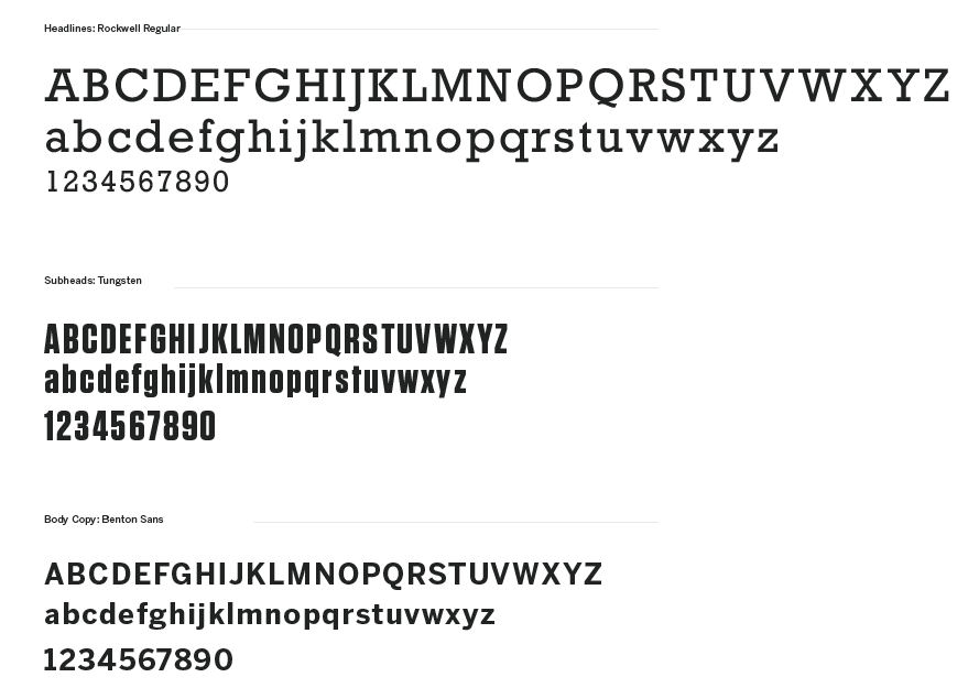 The primary typeface for headlines is Rockwell. All sub-headlines should be Tungsten and body copy should be set in Benton Sans.