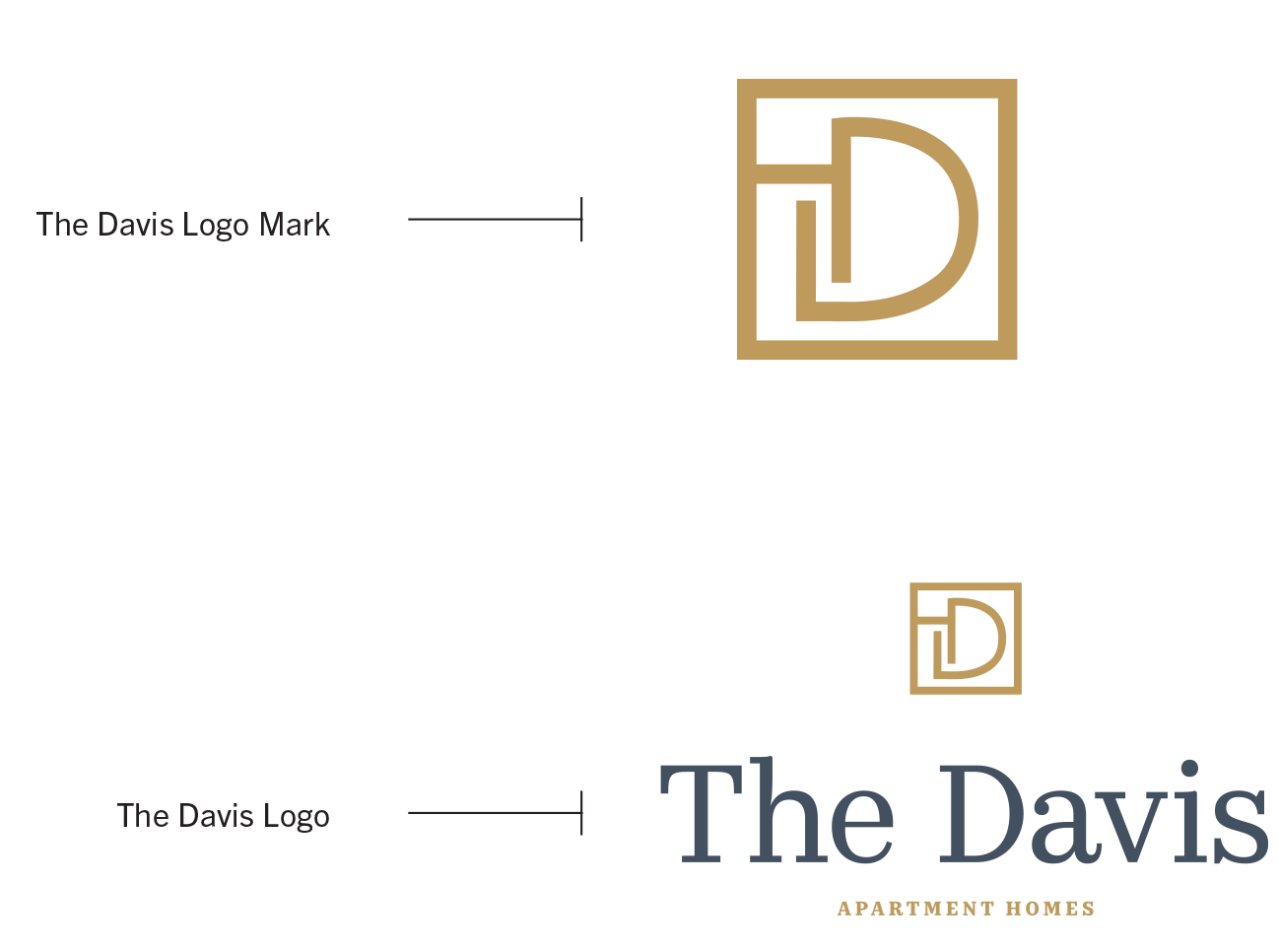 Use The Davis Apartment Homes logo in instances referring to the apartments. The logo mark may be used without typography where the logo is not required/necessary. For example, use logo mark in instances such as social media profiles images, or informal spaces or signs-offs at the last page of a brochure or in the footer of a website.